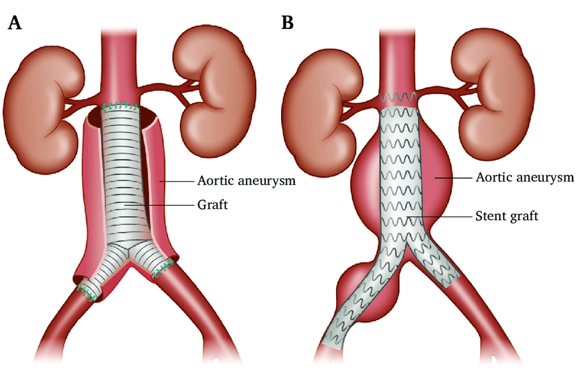 AAA relies on two different surgical methods: Open surgical repair of AAA (A) and Endovascular placement of an aortic stent graft (B).