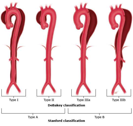 - Stanford Type B Aortic Dissection: This type of tear begins farther down the aorta (descending aorta beyond the arch), and farther from the heart. Like the type A dissection, this usually extends from the descending aorta into the abdominal segment (abdominal aorta), but doesn’t involve the first part of the aorta in the front of the chest. Surgery may or may not be needed immediately, depending on exactly where the dissection is located and if it is or isn’t cutting off blood flow to your organs. These operations usually can be performed with a stent-graft device inserted into the aorta.