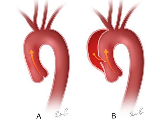 Normal blood flow (A) vs. abnormal blood flow in-between the layers of aortic wall in type A aortic dissection (B)