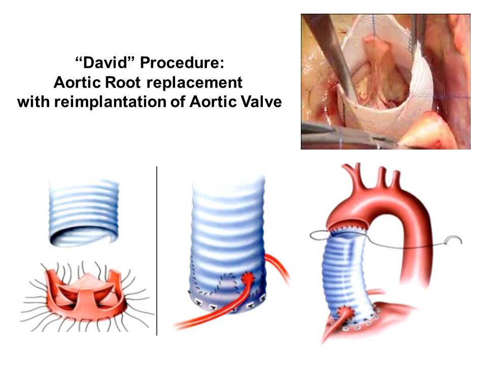 Aortic root disease is often asymptomatic and diagnosed during imaging. To avoid acute aortic syndromes and dissections in aortic root aneurysms (and/or ascending aorta aneurysms), prophylactic surgery of the aortic root should be performed when indicated according to the recommendation of the American Heart Association and European Society of Cardiology guidelines: irrespective of the presence and severity of an associated aortic valve regurgitation, surgery is indicated in patients who have aortic root disease with maximal ascending aortic diameter > 50 mm, even before in case of cardio-vascular risk factors.