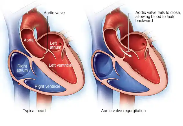 - Aortic valve regurgitation. Blood flows backward through the aortic valve into the heart's main pumping chamber (left ventricle). Aortic valve regurgitation may result from a leaky or dysfunctional valve. Any condition that damages the aortic valve can cause regurgitation. Sometimes, a baby is born with an irregularly shaped aortic valve (congenital heart defect) that leads to regurgitation.